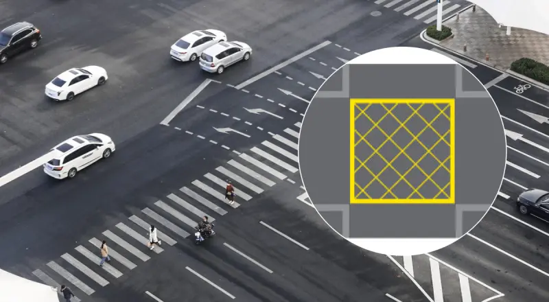 Когда проезд затруднен, желтая коробчатая разметка запрещает водителям выезжать на неё, чтобы исключить создание полного коллапса проезда.
