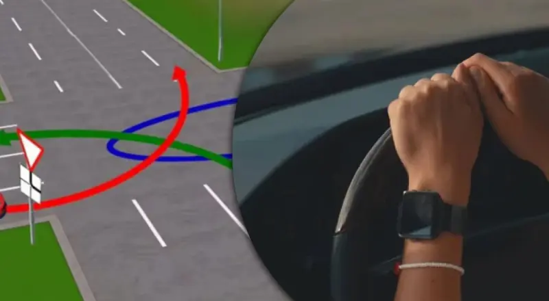 Однако во время разворота он оказывается в ситуации, когда справа приближается зеленый автомобиль, которому нужно уступить дорогу.