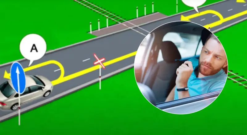 На участке дороги перед железнодорожным переездом водителю серого автомобиля предлагаются три различных варианта для выполнения разворота. На этом отрезке установлен дорожный знак 4.1 "Движение прямо", указывающий на запрет движения в других направлениях и позволяющий проехать только прямо. Железнодорожный переезд не влияет на это правило, поскольку знак, установленный до перекрестка, действует до ближайшего перекрестка.