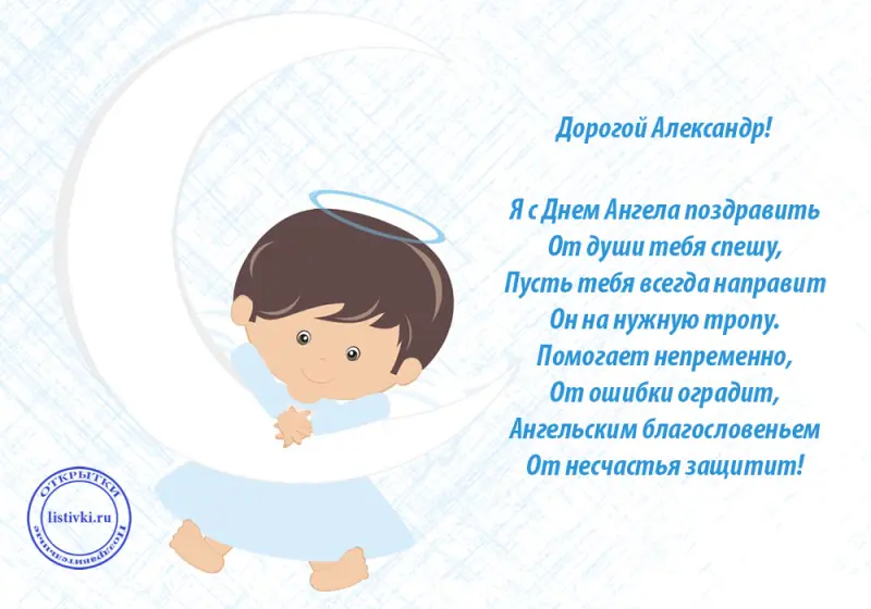 У День ангела хочу побажати тобі, Олександре, щоб твій ангел завжди тебе оберігав і допомагав тобі у всіх твоїх справах – домашніх і робочих, щоб усі твої починання були втілені в життя, щоб тебе завжди супроводжувала удача, процвітання і успіх.