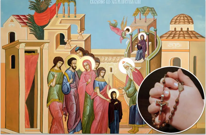 И хотя в канонических Евангелиях это событие не упоминается, красочное его изображение можно найти в более поздних апокрифах. Так, по преданию, маленькая Мария пришла в Иерусалимский храм в возрасте трех лет, где ее встретил Первосвященник Захария, и, подчиняясь гласу Божиему, отвел девочку в Святая Святых, куда ранее допускались только первосвященники один раз в году.