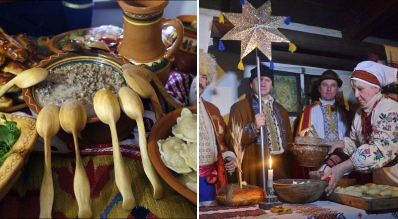 Рождественское меню обычно состоит из таких блюд: кутья и узвар, жареная рыба, винегрет, вареники (с картофелем, с капустой, с вишнями), тушеная капуста, борщ постный с фасолью, жареный картофель, овощи свежие и соленые.