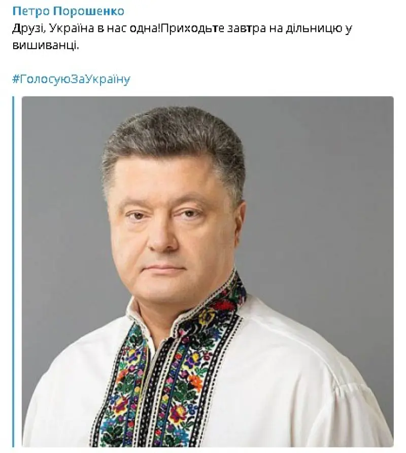 Такой призыв, снабженный хэштэгом "Голосуй за Украину" появился в его телеграм-канале. Его призыв поддержал певец Святослав Вакарчук и мэр Львова Андрей Садовой. Однако сам Порошенко предпочел одеть классический темный костюм и белую рубашку.
