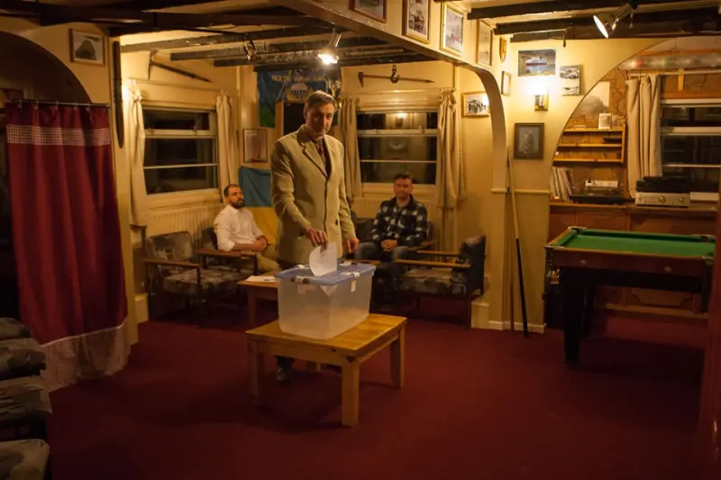 Как сообщает пресс-служба Министерства образования и науки Украины, голосование началось 21 июля в 8.00 по местному времени (14.00 по Киеву). Своеобразный избирательный участок обустроили в помещении станционного бара Фарадей. А урной для голосования служил прозрачный бокс для еды, в котором проделали отверстие для бюллетеня. После голосования и подсчета голосов оригиналы документов перевели в конверты и опечатали их. При случае эти документы будут переданы в Центризбирком.