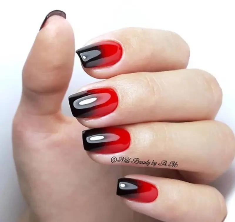 Современно и безумно привлекательно смотрится черно-красный маникюр в стиле омбре – это когда один цвет плавно переходит в другой. Пробуйте, получится невероятно красиво.