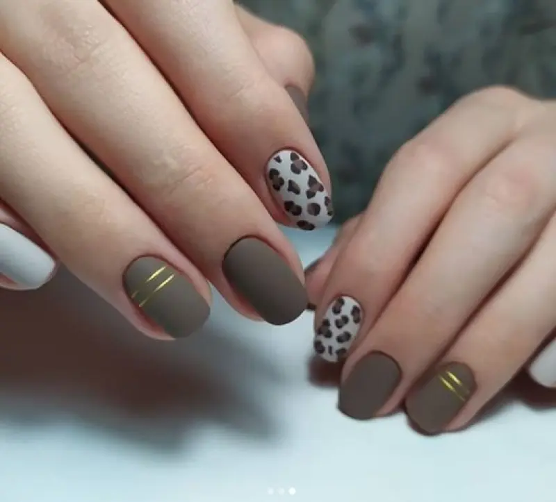 Коричневый цвет идеально «дружит» с леопардовым принтом. При этом нейл-дизайнеры не советуют перегружать ногти. «Пятнышки» хищника достаточно нарисовать на одном-двух ногтях.