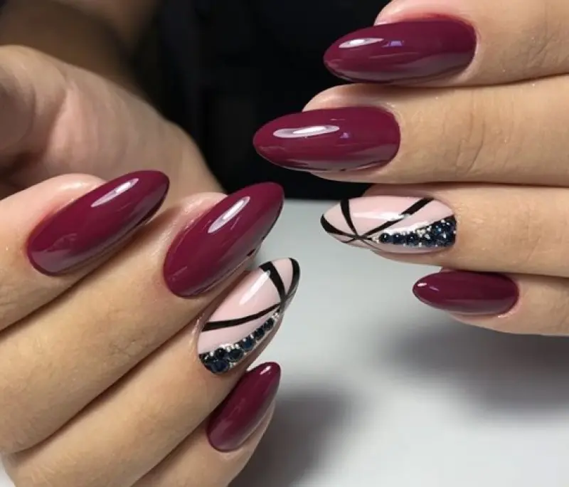 Маникюр марсала очень «гордый», поэтому не терпит сочетания с дургими яркими цветами. Идеальный маникюр марсала – это в основе лак цвета вина, и украшающие элементы – стразы, рисунки, трафареты.