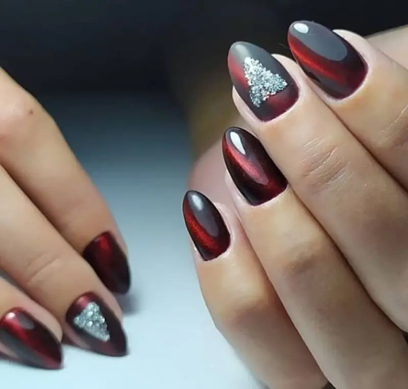 Чтобы заглянуть внутрь потрясающего бордового цвета, сделайте маникюр кошачий глаз. Бордовый маникюр кошачий глаз поражает невероятным сиянием и блеском. Такой вариант маникюра часто дополняют рисунком на одном-двух ноготках.