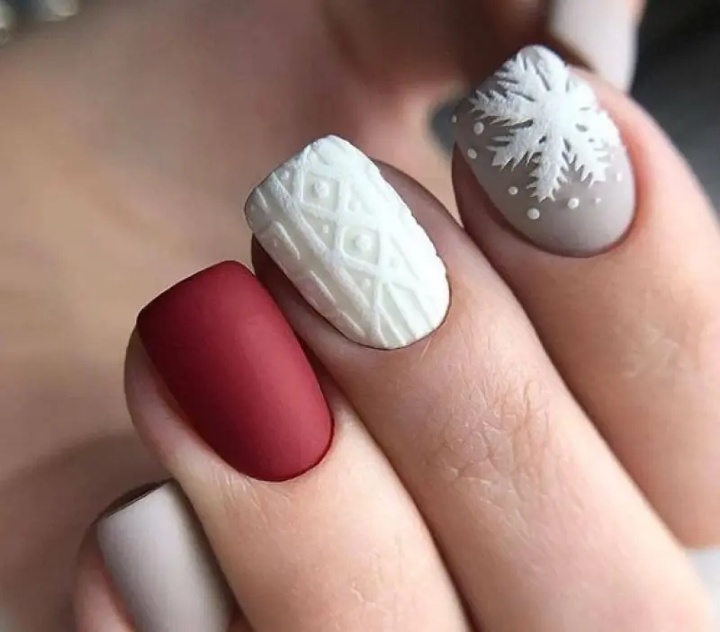 Красный цвет очень привередлив, поэтому хорошо сочетается только с белым, черным и золотым. Как раз то, что нужно к новому году. Поэтому красный зимний маникюр может почеркнуть ваш стиль и сделать образ сильным и ярким. Среди модных идей зимнего красного маникюра – ногти. Украшенные белыми снежинками.