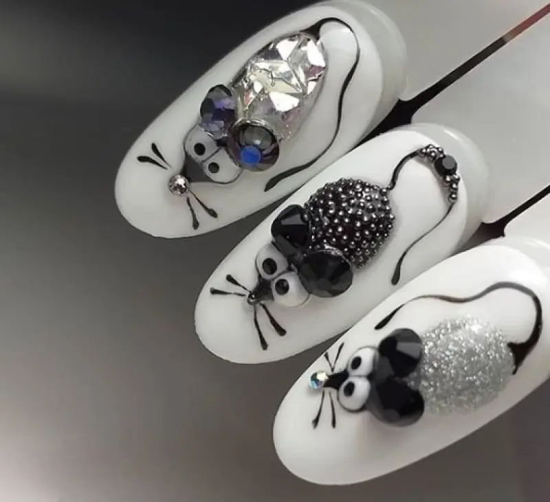 Светло-серый зимний маникюр 2020 - это компиляция с белыми, черными или серебристыми ноготками. А дальше будет уместно все, что касается новогодней тематики – снежинки, елочки, новогодние игрушки, олени, и даже рисунки «виновницы торжества» - крысы.