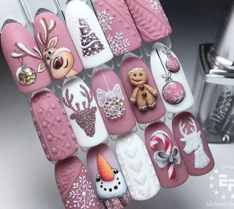 Новогодний маникюр свитер 2020 стал более утонченным и ярким. Можно всего один ноготок покрыть узором, а остальные – стилизовать под Новый год 2020, то есть добавить рисунки. Также можно один-два ногтя покрыть серебристым или золотистым лаком, что придаст более праздничного настроения.