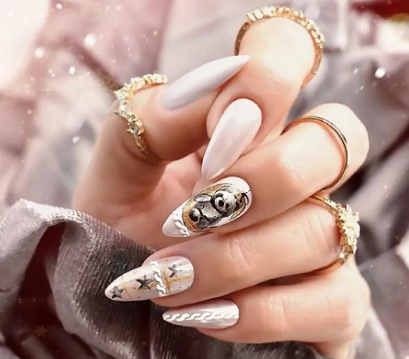 Красивый зимний маникюр паутинка, или как его еще называют «тянучка» – изящное и роскошное решение для маникюра новый год 2020. При этом паутинку можно дополнить блестящими элементами, геометрическими фигурами, звездочками и снежинками, а также скандинавскими узорами, бантиками и всевозможными рисунками на новогоднюю тематику – Крысой, дедом морозом, снеговиком, пингвинами или оленями.