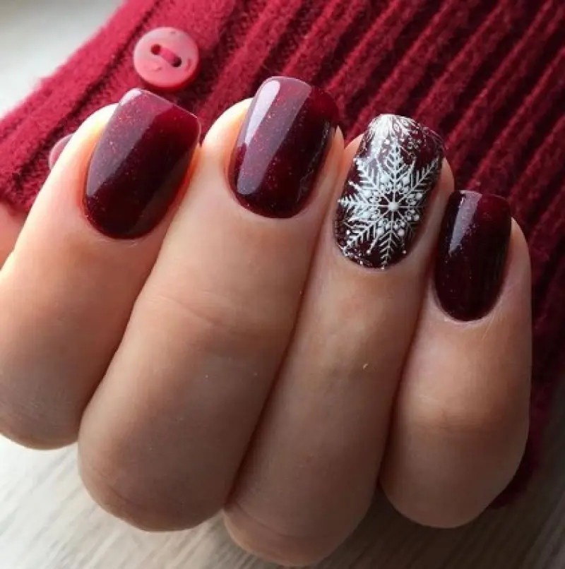 Красивый маникюр зима 2020 марсала – это один ноготок в нюдовом или белом цвете, остальные в цвете марсала. При этом на светлом ноготке следует нарисовать что-то в новогоднем стиле, например, – елочку, снежинку или елочную игрушку.