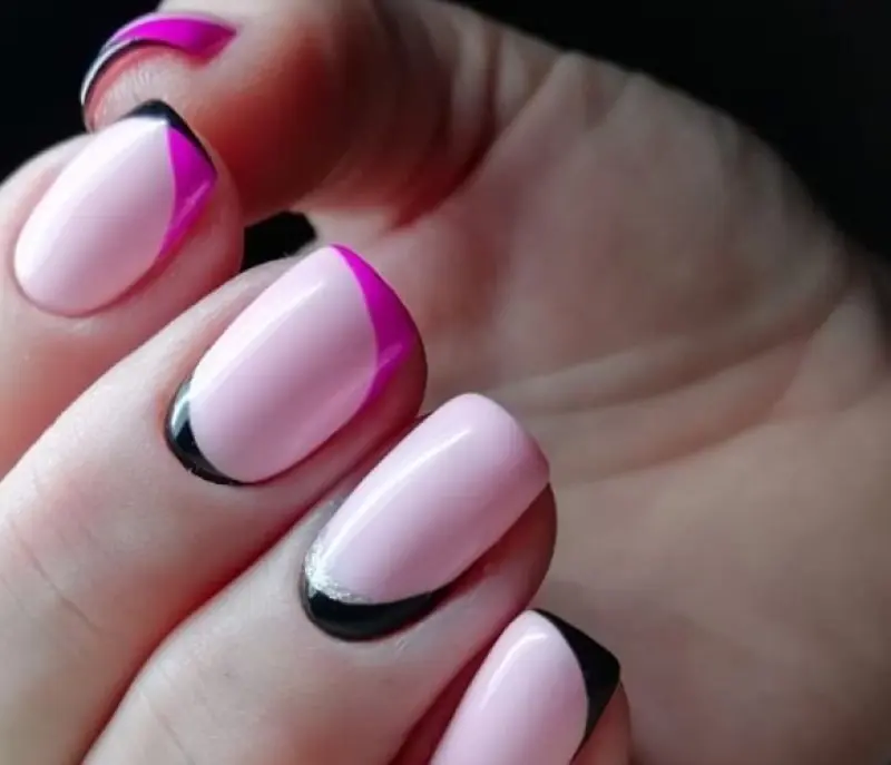 Нюдовые ногти с двумя черными полосками на кончиках – это незабываемый французский маникюр 2020. Кстати, пространство между двумя полосами можно сделать на тон светлее – получится довольно эффектно.