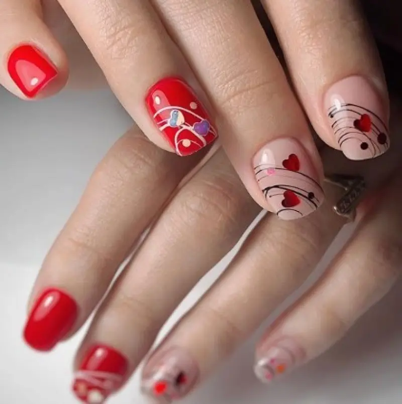 Если в сердце живет реально чувство, то выразите его при помощи красивого красного маникюра на день влюбленных. Все ногти покрываете красным глянцевым лаком, а безымянный – нежно-розовым. Добавляете немножко красного – словно брызги шаманского. И по центру ногтя на безымянных пальцах рисуете выразительное сердце.
