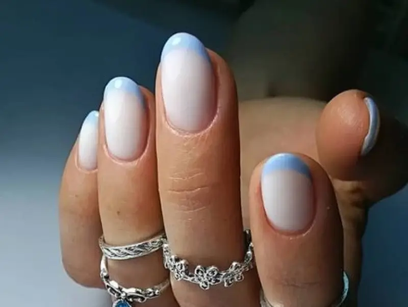 Блакитний колір і всі його відтінки відмінно поєднуються з тілесним, тому якщо ваш улюблений манікюр – це френч, то обов'язково спробуйте його з блакитним лаком. Крім того, можна зробити подвійний французький манікюр – скажімо, візьміть два відтінки блакитного лаку, і розділіть усмішку на дві частини – контрасти зачаровують.