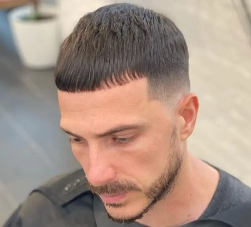 Хто сказав, що стрижка цезар - це тільки дуже коротке волосся? Можна зробити цезар з трохи подовженим волоссям на маківці, водночас потилицю і скроні стрижуть як в традиційному варіанті, а чубчик – все такий же ідеально прямий.