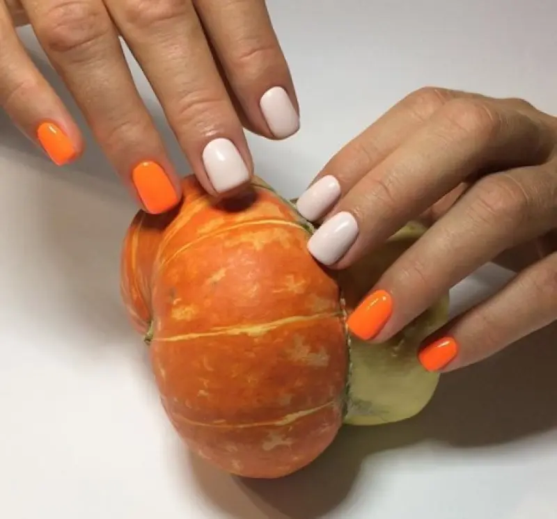 Якщо хочете світу щось сказати, можете всі нігті пофарбувати помаранчевим лаком, а один-два – білим або бежевим, і на цих світлих нігтиках малюйте все, що вам цікаво зараз і що для вас важливо: осінні квіти, фрукти, листя, тварини або навіть напишіть слова. З одного боку, вийде дуже цікавий манікюр, а з іншого – він не дуже помітний, щоб поставити вас у незручне становище.