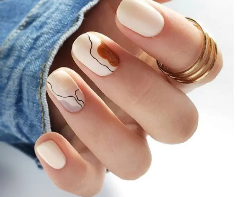 Короткими нігтями сьогодні нікого не здивуєш, тому існує безліч стильних варіантів дизайну для таких нігтів. Все, що вам потрібно - просто пофарбувати нігті бежевим лаком, і прикрасити кілька нігтів абстракцією, геометричними фігурами, смужками або фольгою.