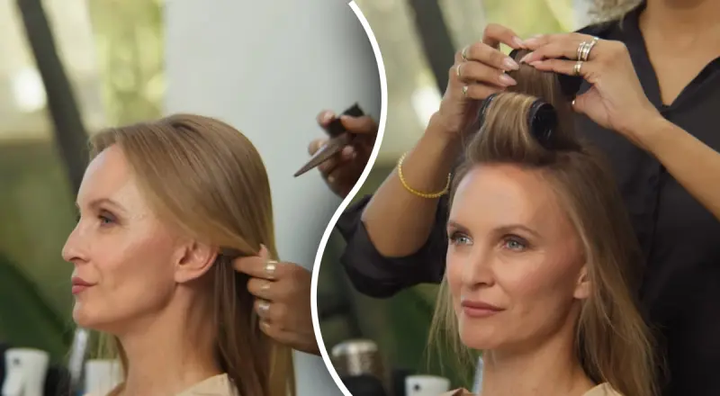 "Мы возьмем стайлинговую щетку для волос", - добавила Мирна, начесывая текстурированную закрученную прядь, чтобы продолжить и показать третий образ.