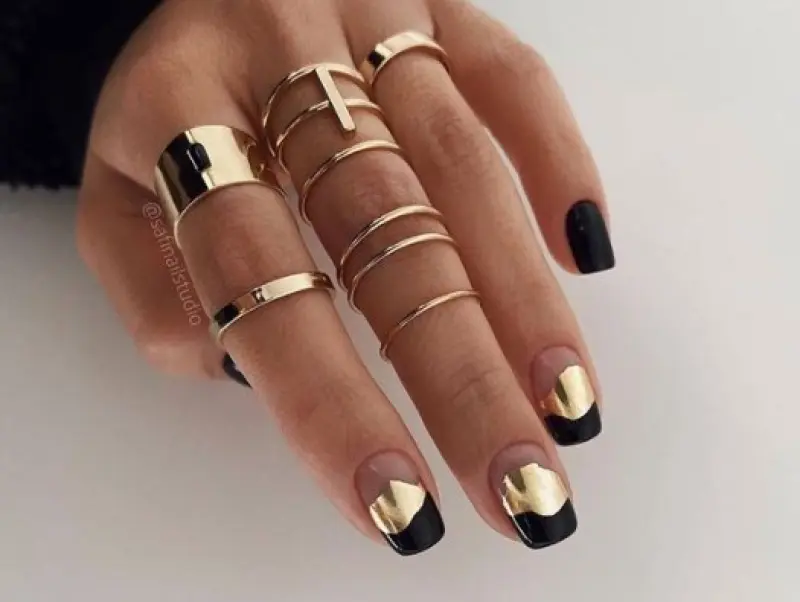 Черный цвет идеально сочетается с золотым, и в дуэте эти два сильных цвета выглядят потрясающе. Но для того, чтобы такой маникюр выглядел действительно стильно и модно, используйте в дизайне ногтей нюдовый лак: можете покрасить один-два ногтя телесным лаком, или оставить небольшие прозрачные участки возле кутикулы на некоторых ногтях.
