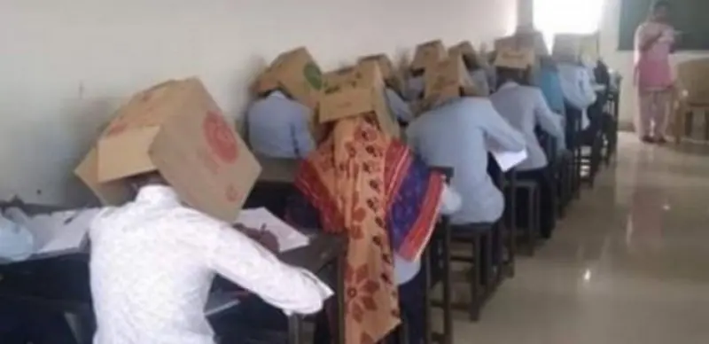 В Индии разгорелся скандал из-за того, что преподаватели нашли оригинальный способ борьбы со списыванием студентов – их заставили сдавать письменный экзамен по химии с картонными коробками на головах.