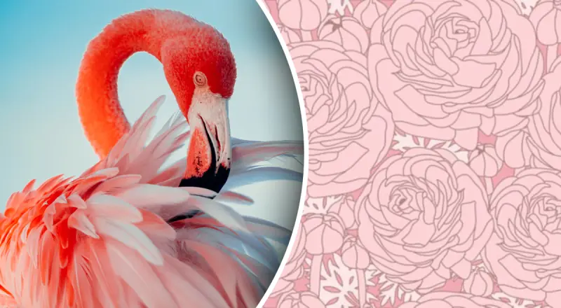 Фламинго можно увидеть в нижней части изображения. Наличие большого количества розовых цветов на розовом фоне затрудняет распознавание птицы, потому что она также имеет розовый цвет. На рисунке ниже фламинго обведено кружком.