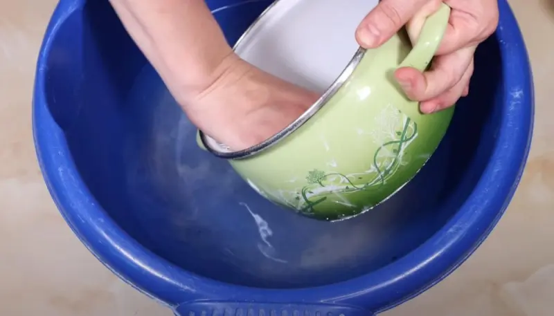 Берем тазик с горячей водой, мочим в ней губку, и чистим кастрюлю.