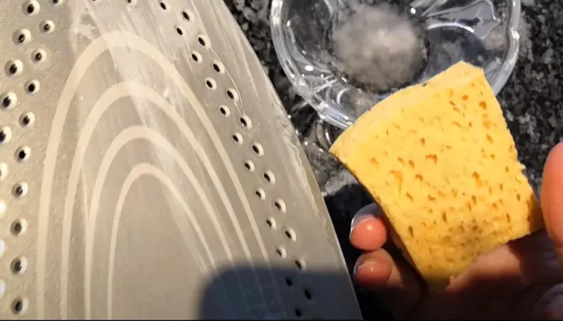 Подошва вашего утюга снова должна стать чистой. Смываем остатки соды губкой, смоченной в простой воде.