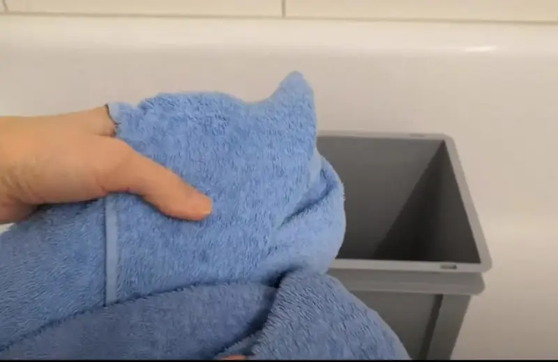 Далее нужно достать тряпку, аккуратно, чтобы не обжечься, извлечь ее из кулька и положить в раковину. Включаем холодную воду и остужаем тряпку. Когда тряпка станет просто теплой, нужно ее прополоскать.