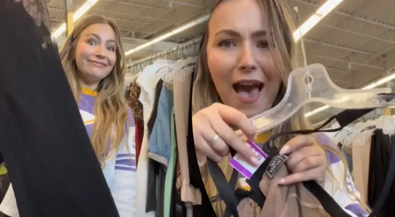 В начале ролика Сара стоит возле вешалки с одеждой из магазина эконом-класса. Она берет платье и показывает ценник в 17,49 канадских долларов вместе с ярлыком Gianni Versace.