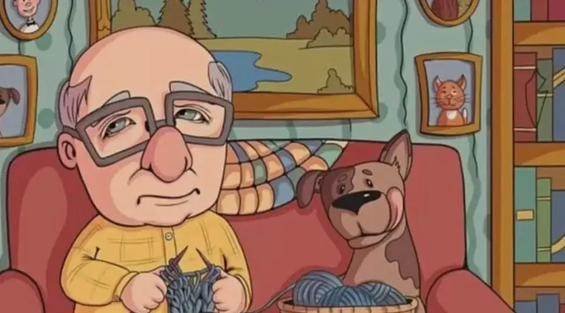 На картинке изображен пожилой мужчина, удобно развалившийся на диване в сопровождении своей верной собаки в уютной гостиной. На первый взгляд все кажется обычным, но в этой обстановке искусно спрятана бабочка. Только те, у кого острое зрение и четкая фокусировка, смогут найти ее быстро!