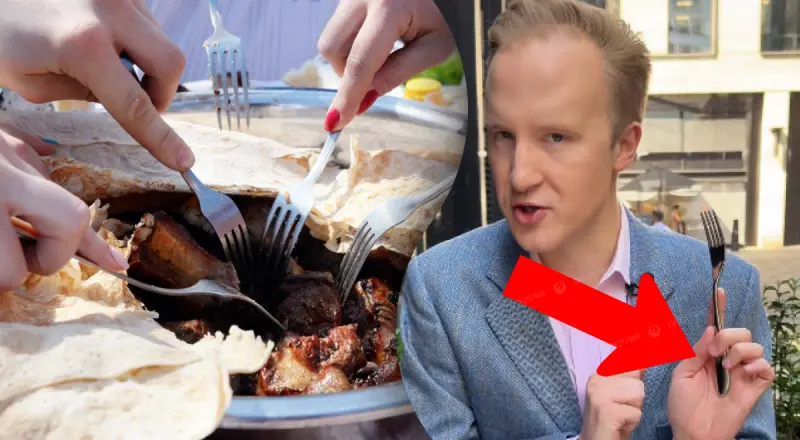"Вот как надо держать вилку. Теперь, когда вы пользуетесь ножом, вилку держат в недоминантной руке, зубцами к тарелке, указательный палец тянется вниз по вилке, останавливаясь перед перемычкой, а ручка находится в мясистой части руки", - сказал эксперт по этикету.