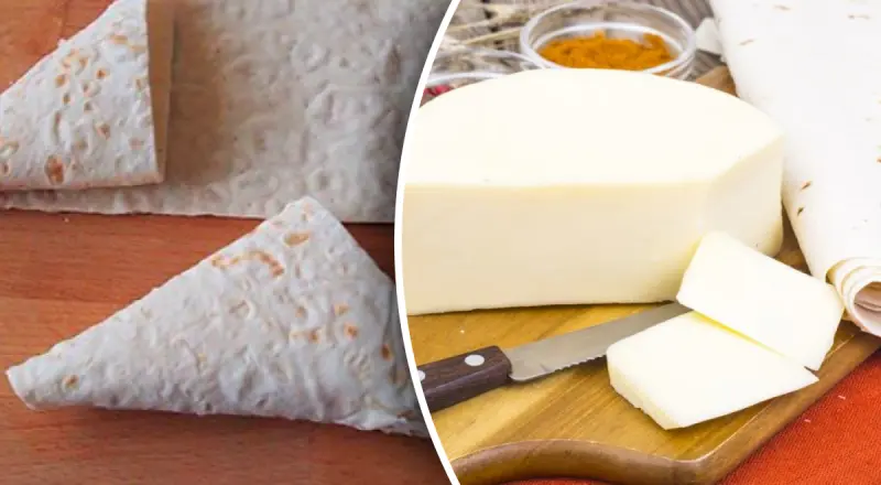 Подготовьте лаваш. Порежьте его на равные полоски. Сверните края лаваша в форму треугольника, спрячьте начинку - порезанный твердый сыр.