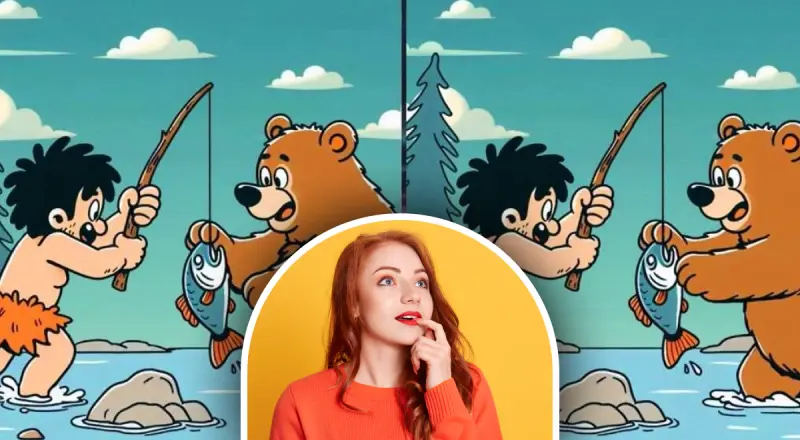 В следующей загадке нужно отыскать три различия между картинками, на которых изображены мужчина и медведь, которые рыбачат пишет jagranjosh.