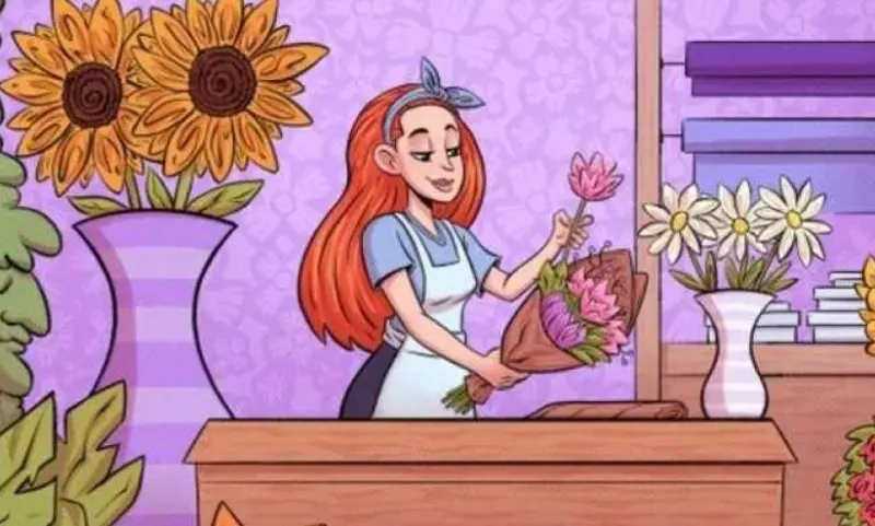 На картинке мы видим цветочный магазин, в котором девушка составляет букет. Вокруг нее очень много разных цветов.