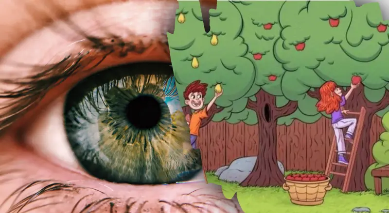 На изображении вы можете видеть двух детей, собирающих фрукты в саду. Мальчик собирает с дерева груши, а девочка справа собирает яблоки.Но настоящая задача этой оптической иллюзии — обнаружить три жутких рожицы, спрятанных где-то на картинке.