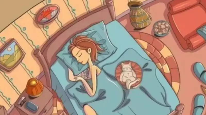 На картинке – комната, в которой на кровати спит девушка. Рядом с ней спит и кот. А вот где кролик – тот еще вопрос. Но он где-то рядом. Смотрите внимательно и, возможно, вы его все-таки найдете.