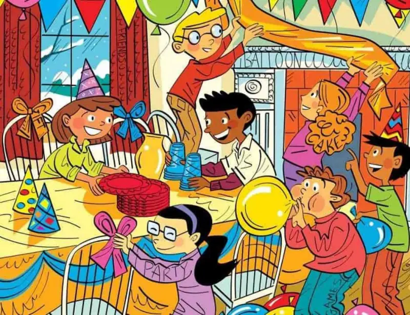 На изображении – комната с людьми. Они радуются и готовятся к праздничному столу. Также на картинке несколько надписей на английском языке – Gift (подарок), Friends (друзья), Balloon (шарик), Cake (пирожное), Games (игры), and Party (вечеринка).