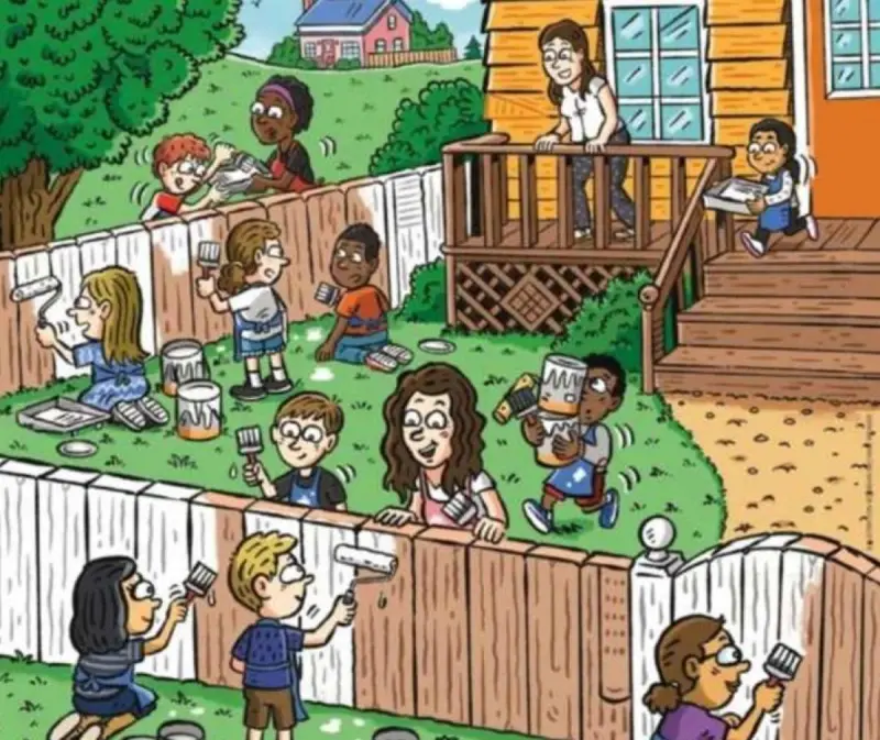 На картинке – люди, которые красят забор возле дома. Каждый из них занят каким-то делом. Ваша задача – отыскать морковку. Смотрите очень внимательно, чтобы найти овощ.
