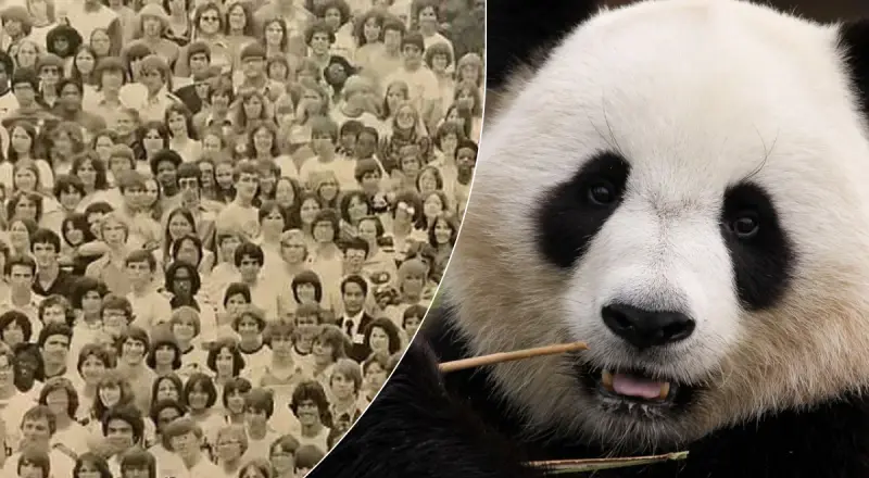 Вам удалось обнаружить панду? Она спряталась между мужчиной в очках и женщиной.