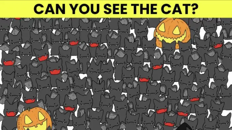 Посмотрите внимательно на картинку ниже. На ней вы увидите множество черных летучих мышей, ярко-красные рты и несколько тыкв. Но среди них прячется один хитрый маленький кот. Сможете ли вы его заметить?