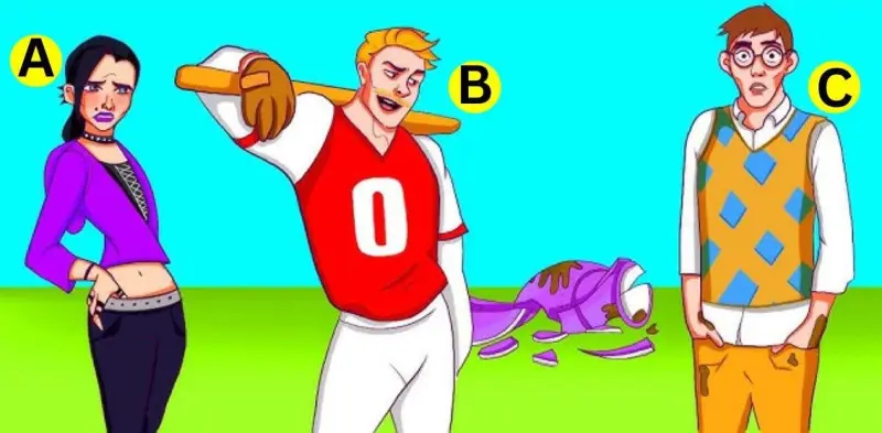 На картинке мы видим трех людей - женщину и двух мужчин. А позади них - разбитая ваза. Только один из изображенных людей является виновником уничтожения вазы.