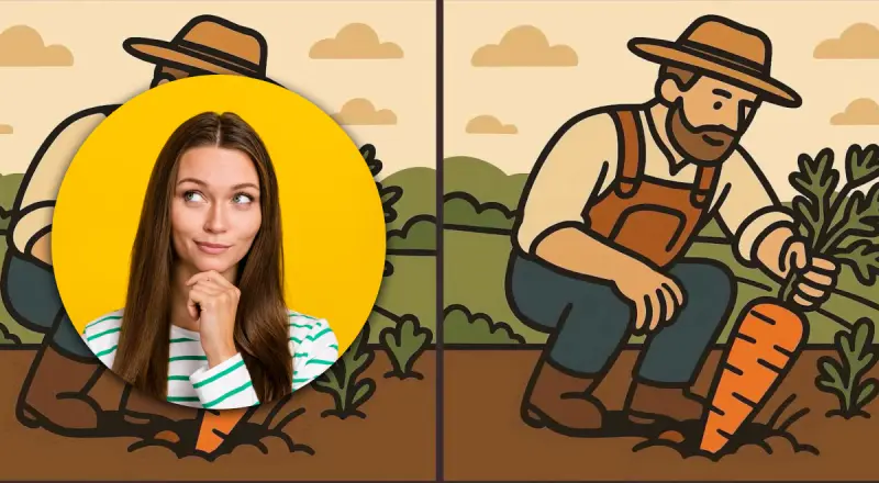 Внимательно посмотрите на два изображения фермера, который собирает морковь.