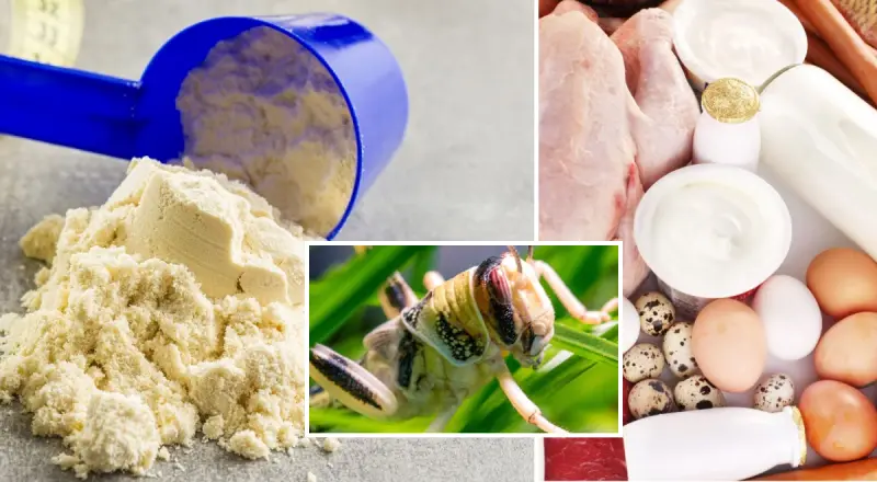 Некоторые протеиновые порошки изготавливают из насекомых, преимущественно сверчков, утверждает Тalk-commerce. Сверчки являются устойчивым источником белка, который широко используется в нескольких пищевых продуктах, включая белковые порошки. Другие потенциальные источники - мучные черви и шелкопряды.