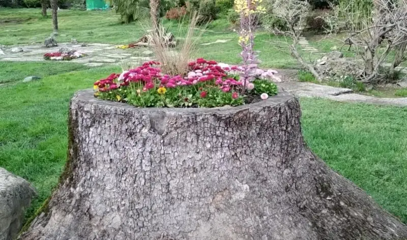 Можно выдолбить углубления в пеньке и посадить суккуленты. Углубления после их посадки увеличиваются, после этого засыпаются землей и превращаются в цветник.