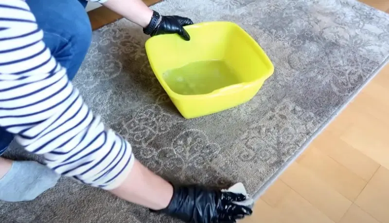 Нужно смешать все компоненты и перелить их в пульверизатор, из которого надо побрызгать равномерно весь палас. Проходимся по ковру мягкой щеткой и оставляем раствор на ковре на 10-15 минут.