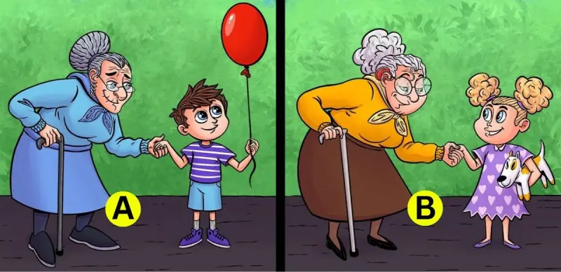 Мы видим на картинке двух бабушек, каждая из которых держит за руку своего внука или внучку. Сначала может показаться, что ничего странного или необычного на рисунках нет - мол, это простая привычная для всех семейная сцена. Но не дайте этой обманчивой обычности обвести вас вокруг пальца.