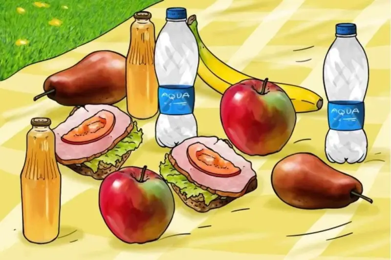 Мы видим на рисунке продукты и напитки, которые разложены на скатерти для пикника.