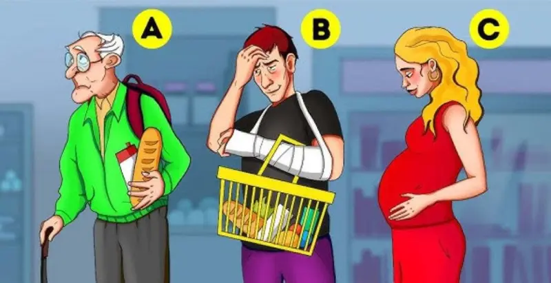 Представьте себе: вы находитесь в продуктовом магазине, где трех человек подозревают в краже - пенсионера, мужчину с переломом руки и беременную женщину. Именно их мы сейчас видим на картинке.